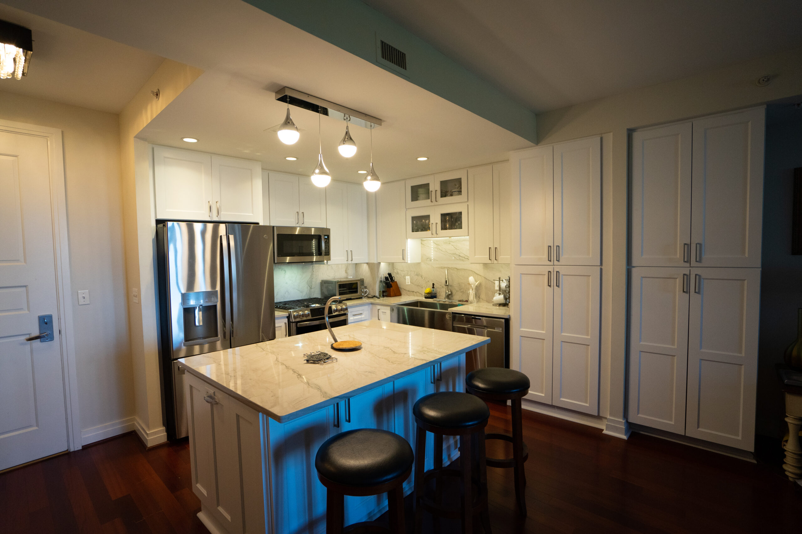 The stunning marble countertop paired with a full-height backsplash instantly elevates the space, creating a high-end, luxurious feel. The transformation resulted in a kitchen that feels open, fresh, and timeless—proof that the right design choices can completely redefine a home.