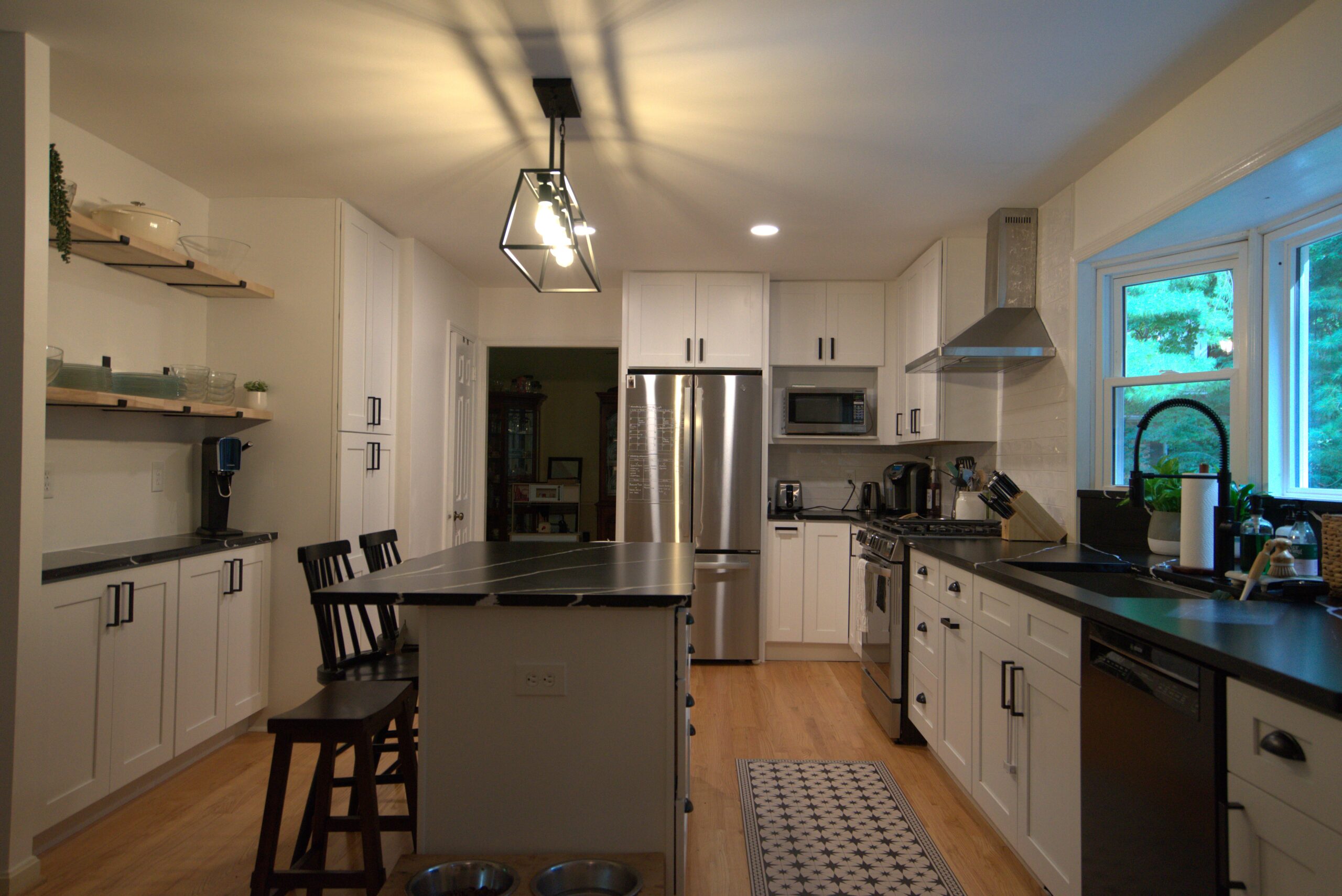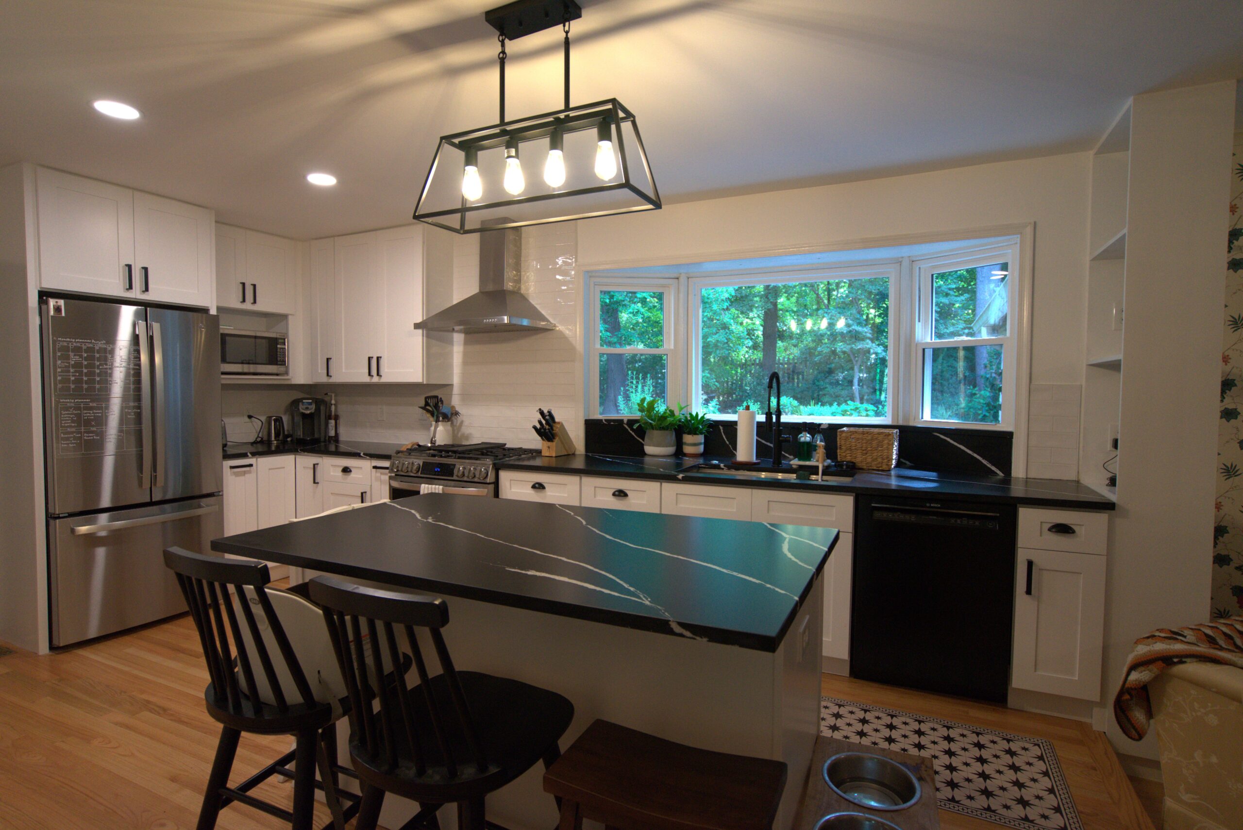 Durable black quartz countertops were added for contrast and longevity, striking the perfect balance between style and practicality. The combination of white and black creates a timeless, elegant look that makes the kitchen feel fresh, open, and inviting.